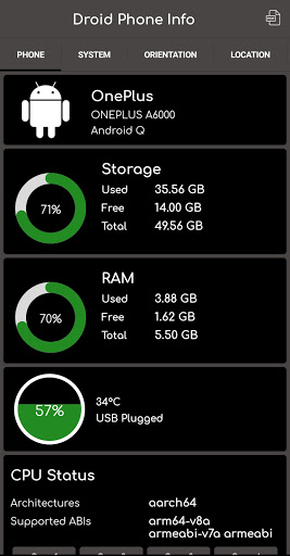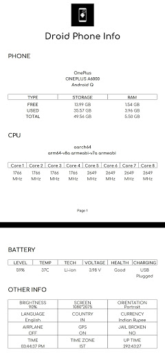 Droid Phone Info를 사용하면 장치에 대해 자세히 알 수 있습니다.장치의 하드웨어 및 소프트웨어에 대한 모든 필요한 정보와 모든 정보를 PDF로 내보낼 수 있습니다.여기에 포함 된 정보 :