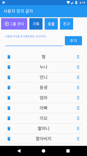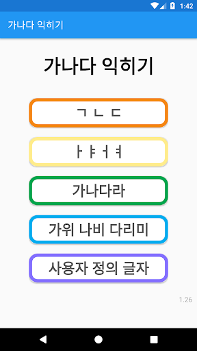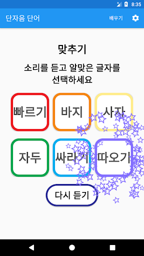 읽어주는 소리를 듣고 알맞은 글자를 선택합니다. 1. 자음 2. 모음 3. 가나다라 4. 단어 5. 사용자 지정 단어