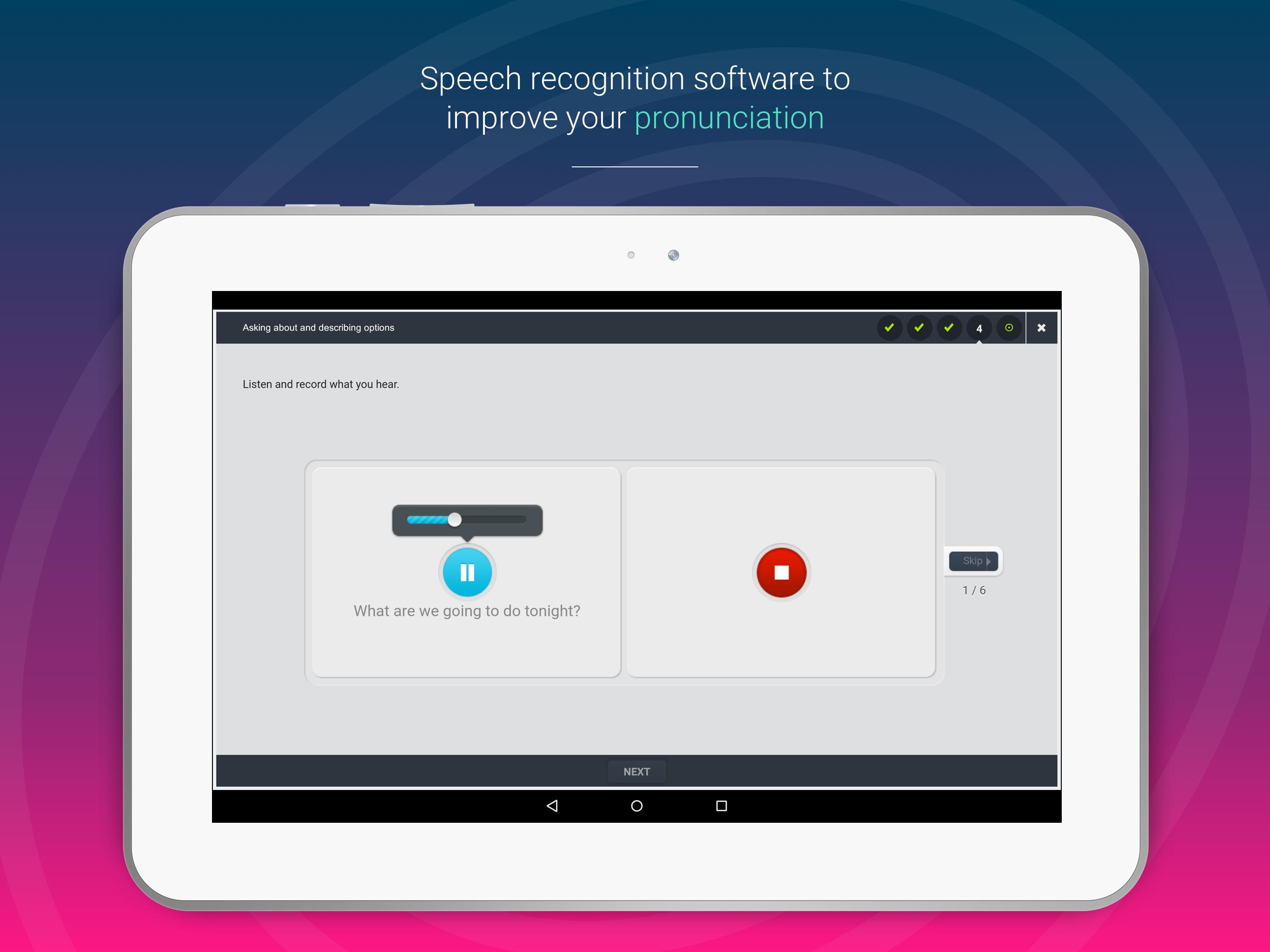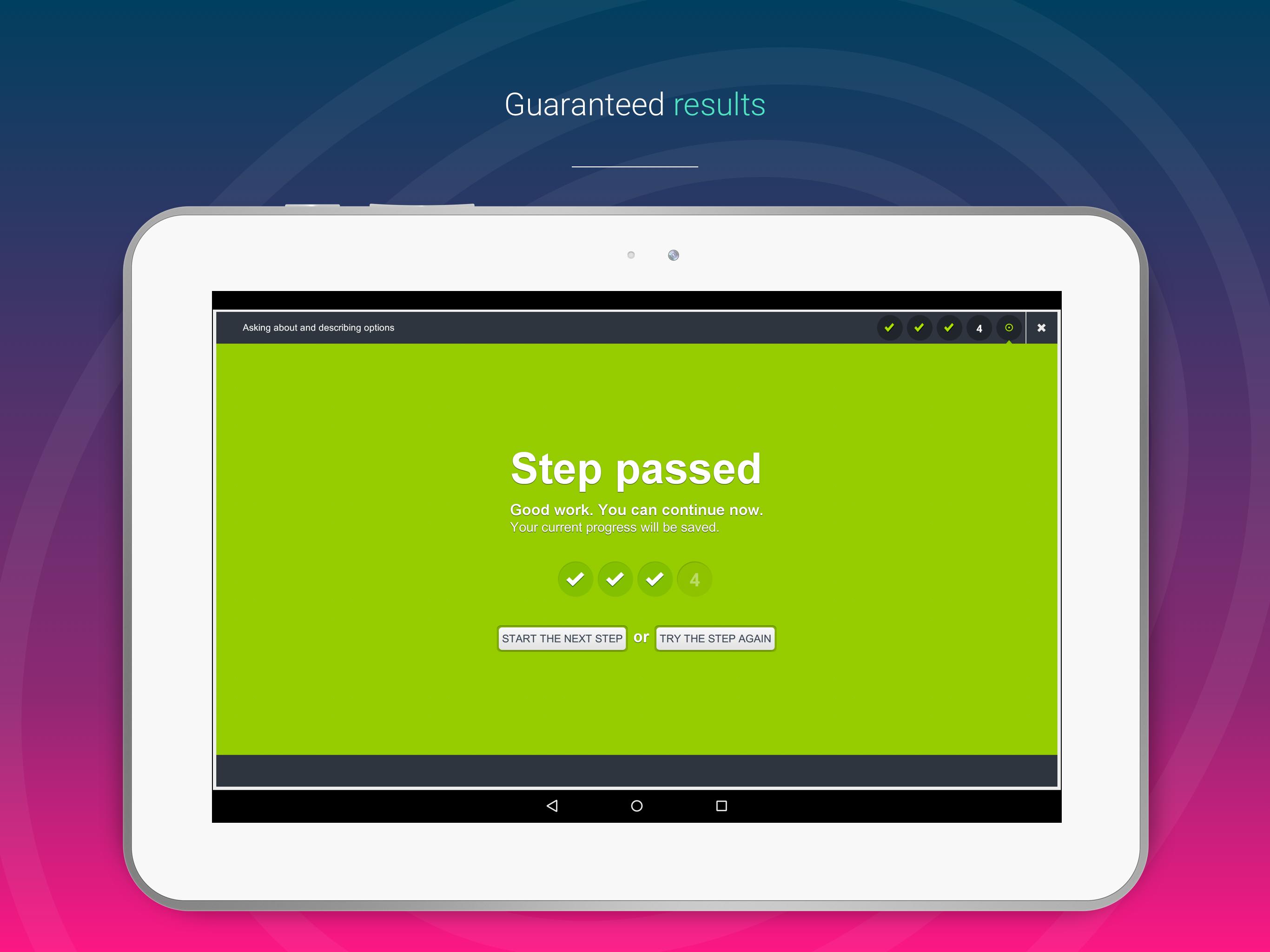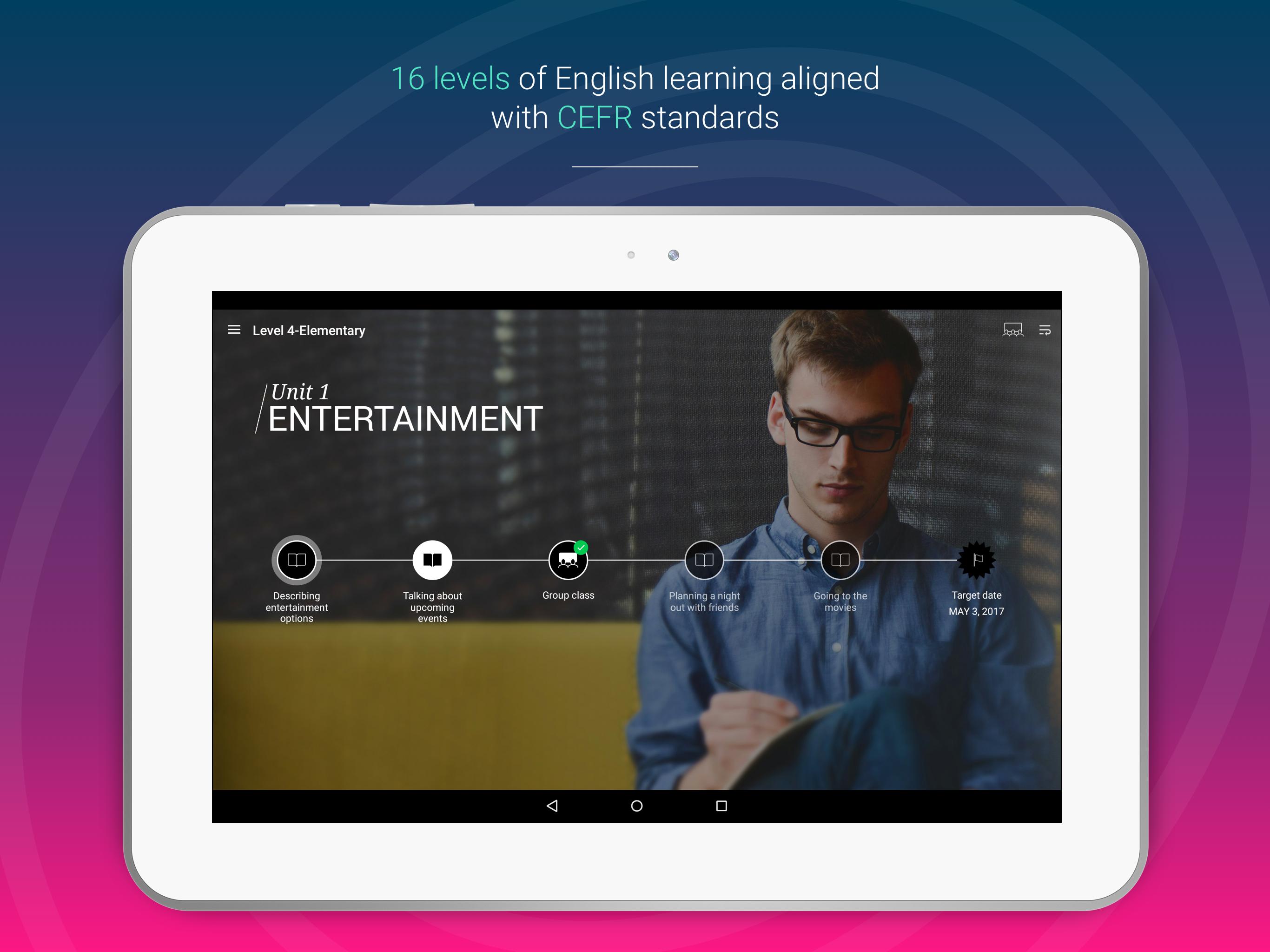But our app offers more than just conversation classes. It’s a comprehensive and interactive course that leads you step by step through the the everyday English skills you need for work, travel and more. You'll find 16-levels of multimedia lessons, pronunciation practice and 100s of hours of vocabulary and grammar exercises.