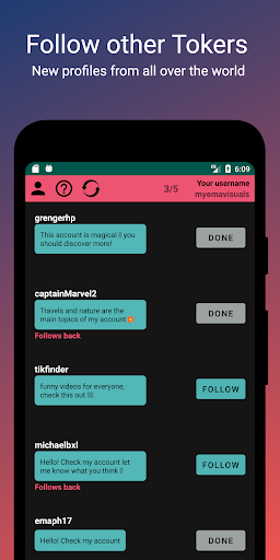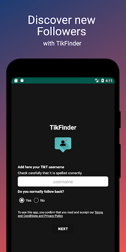 Tikfinder는 어떻게 작동합니까? 쉬운! 단순히 사용자 이름 (비밀번호 필요 없음)을 사용하면 목록에서 찾은 다른 사용자를 팔로우하고 앱에 프로필을 게시하여 다른 토커가 계정을보고 팔로우 할 수 있도록!