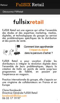 “Comme un interrupteur à message mobile personnalisé, géolocalisé. Je passe devant je reçois un message , j’évolue dans sa zone on me détecte et me trace …. »  explique Claire KORALEWSKI, Directrice Générale de FullSIX Retail .  Pour toute info : contact@F6retail.fr
