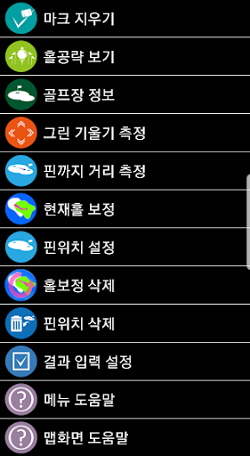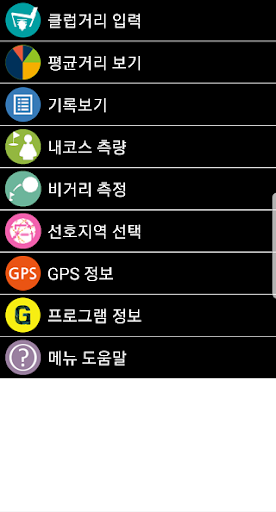 - 클럽거리입력, 평균거리보기, 기록보기, 내코스측량, 비거리측정, GPS 정보, 프로그램 정보