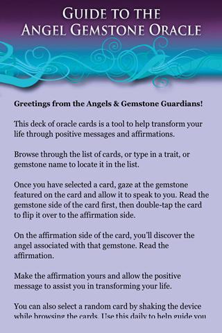 크리스탈을 선택하면 카드를 두 번 눌러 카드를 뒤집어 Angelic Sechomation을 읽으십시오. 다시 탭하여 완전한 크리스탈 이미지와 그 의미를보십시오. 그런 다음 카드 정보를 짹짹하거나 친구에게 이메일을 보내드립니다. 덱을 스크롤하려면 왼쪽 또는 오른쪽으로 스 와이프하여 다음 또는 이전 카드를 볼 수 있습니다.