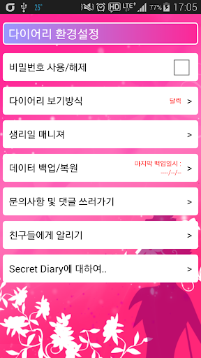 *다이어리 백업 기능: 휴대폰 초기화나, A/S시 다이어리가 지워질 것 같다면! 일정/일기/메모/비밀번호를 모두 백업할 수 있도록 하겠습니다.