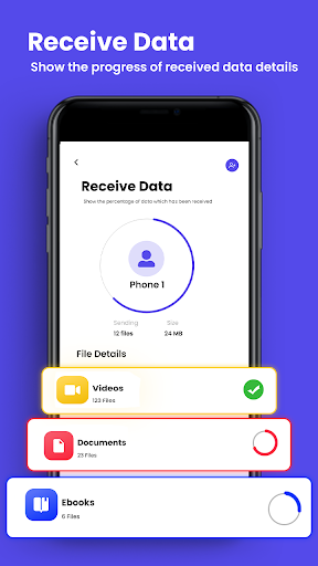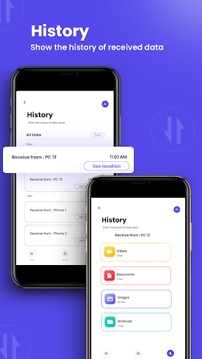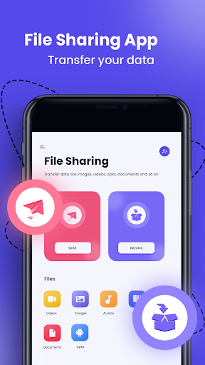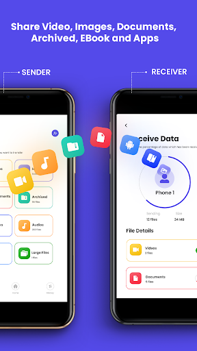 File share app lets you share all data content from one android device to another. The file transfer app for android is a cross-platform for sharing data and is designed to send multiple large files without any limitation. Feel free to transfer your favorite applications, images, videos, audio files, and important documents.