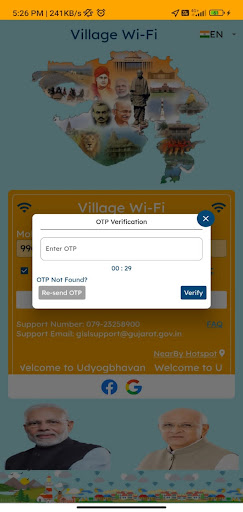 휴대 전화 번호에 등록하면 OTP가 휴대 전화 번호로 보내야합니다. 해당 OTP를 입력해야하며 Wi-Fi 연결로 인터넷을 즐길 수 있습니다.현재 구자라트의 약 8000 개 마을에서 마을-와이파이에 접근 할 수 있습니다.