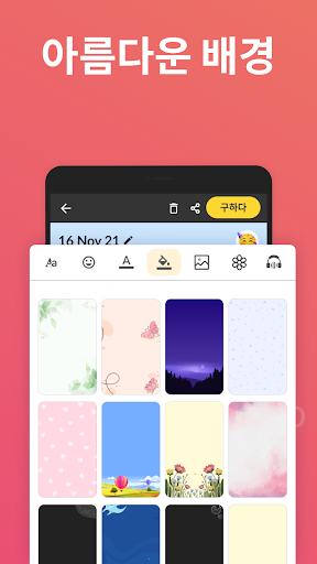 스타일 및 사용자 지정: 이 일기 앱을 사용하면 작성하는 모든 메모를 사용자 지정할 수 있습니다. 매일 쓰고 싶은 커스텀 폰트를 선택할 수 있습니다. 각 음표마다 기분에 따라 다른 색상을 선택할 수도 있습니다.