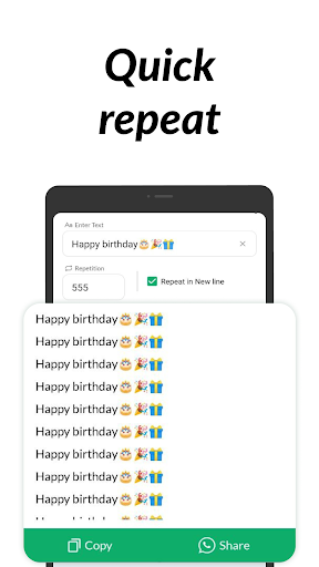 시간은 짧고,이 시대에 더 짧습니다.텍스트를 통해 우리의 말에 강조하고 싶은 상황이 있습니다.당신이 특별한 누군가가 당신에게 정말로 화를내는 상황이며, 당신은 당신의 가장 깊은 사과를 전해야합니다.또는 500 개의 반복 된 단어를 통해 텍스트를 폭파하여 친한 친구를 의도적으로 귀찮게하고 싶습니다.또는 당신은 당신의 애정의 말을 통해 텍스트 폭격으로 친구들에게 당신의 미친 애정을 보여주고 싶습니다.'나는 당신을 사랑합니다 '10000 번, Android 용이 텍스트 리피터 앱은 유용합니다.이 텍스트 폭격기 응용 프로그램에서 텍스트 문자열을 입력하여 고유 사과 텍스트를 만들 수 있습니다.이 매우 쉬운 앱을 사용하여 버튼을 한 번만 클릭하면 텍스트를 여러 번 반복 할 수 있습니다.