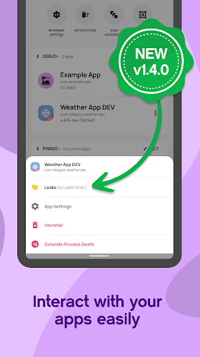 If your app has LeakCanary installed, the exposed LeakCanary Launcher Activity (aka "Leaks" app) will now be accessible through the App Details bottom sheet.