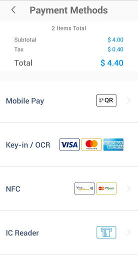 신용 카드 결제를하거나 OCR하여 고객의 신용 카드 또는 수동으로 키 정보 트랜잭션이 완료하게 스캔.