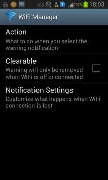 Wifi manager notifies you of wifi connection and disconnection. Wifi manager allows you to disable wifi, enable and other wifi setting. If you always turn on and off your WiFi connection depending on where you are to save battery, but hate to remember to turn in on when you are in you WiFi this is the best app for you.