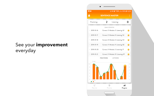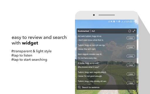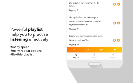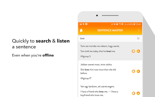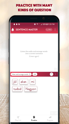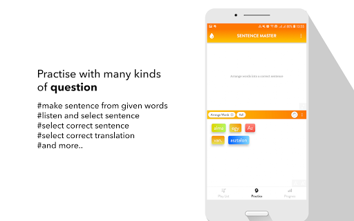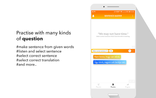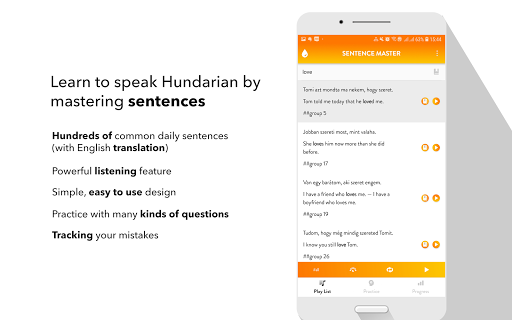 All the app's features are designed to help you learn to make Hungarian sentence and improve the main skills: Listening to a sentence, writing (making) a sentence correctly, speaking a sentence/a phrase correctly.