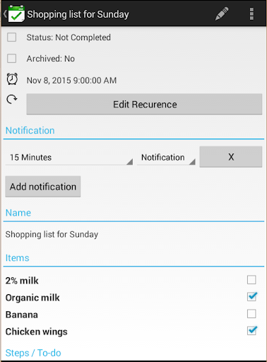 - Recurrent task - daily, weekly, etc with customizable settings.