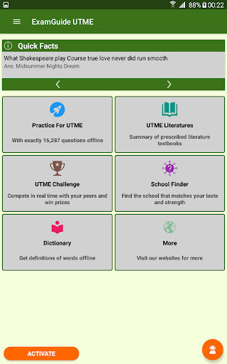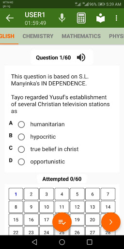 ExamGuide for UTME는 응시자가 믿을 수없는 방식으로 시험을 준비하는 데 도움이되는 전자 학습 및 테스트 앱입니다. 그것은 수많은 질문, 텍스트 음성 기술, 음성 제어 및 지능형 개인 조수가 있습니다. 그것은 나이지리아에서 가장 대화 형 CBT 소프트웨어입니다. 또한 ExamGuide는 100 % 오프라인으로 작동합니다. 앱을 설치 한 후 다른 콘텐츠를 다운로드 할 필요가 없습니다. 설명과 함께 24 개 주제로