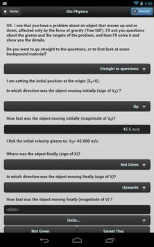 This app solves physics problems for you and it shows you how it does it.You don't have to deal with the formulas and to do any calculations. The app has a list of topics that it can handle. You click on the topic of your problem, and that starts a chat. The app asks you questions about the givens of the problem and what you have to find out (the targets). It then displays the solution and the details of the derivation. It also converts the units of the givens and the results (if you want to).