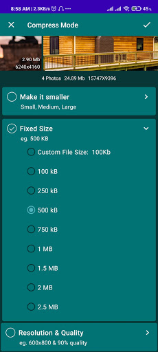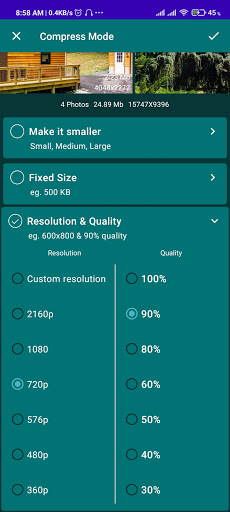 * 앱에서 사진을 압축하는 가장 간단한 방법으로 작아집니다. 품질과 해상도 간의 균형을 유지하는 3 가지 기본 압축 선택 사항이 있습니다.