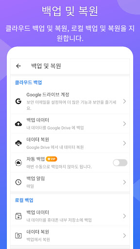 - 클라우드 백업 및 복원, 로컬 백업 및 복원을 지원합니다.