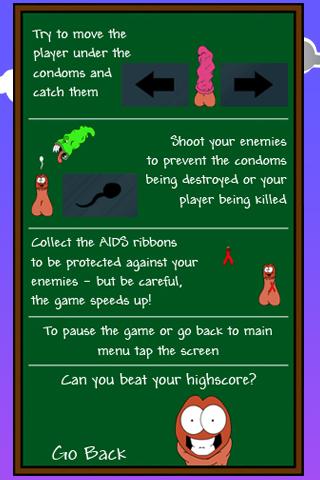 Catch The Condom is an actionbased arcade game Try to beat the highscoreCatch The Condom is an actionbased arcade game to remind you the importance of using condoms in a funny way.You have to collect the condoms and collect the points. You can also make combos to earn more points for each catched condom. But be careful shoot the enemies to prevent the condoms being destroyed or your player being killed.The more points you earn the more the game speeds up how long do you last?Can you beat the global highscore?If you have any bugs or exceptions please get in contact with me or send the stack trace via market. Please tell me on which device you39;ve got that issue.search tags arcade, game, speed, fun, funny, comic, hiv, aids, world aids day, condoms, highscore, shoot, strategy