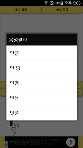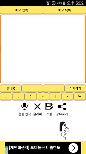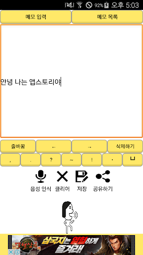 음성 인식 메모장 간단한 음성인식 메모장 어플입니다. - 음성인식으로 메모 작성 기능 - 음성인식으로 작성된 메모 수정 기능 - 메모내용을 SMS, 이메일, 트위터, 그리고 일반 텍스트를 허용하는 다른 앱으로 공유 요구 사항 : * Google 음성 검색이 작동하려면 Google 어플리케이션이 설치되어 있어야 됩니다. (Voice To Text, 음성 인식, 음성인식 메모장, 음성인식)