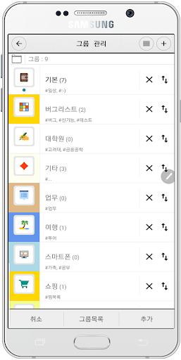 - 그룹(폴더) 지원(그룹별 테마, 아이콘, 그룹내 메모 배경, 그룹전용태그, 잠금등 설정)