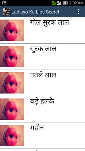 Yeh app designed kiya gaya he ladkiyo ko jane ke liye. Aap ladkiyo ka swabhav jan sakte hai unke lips dekhkar. Yeh app aapko help karega ki ladkiyo ko kaise pataye aur aapna jeevan bhar sathi banaye.Aur aapne sansar ko aacha banaye.yeh app cover karta hai ki aap hot ladki ya hot aunty aur bhabhi ko kaise jaane woh bhi audio mein.is app ke madat se aap women body secrets bhi jan sakoge. is mein bahut audio diye hai jo aap ko help karenge.