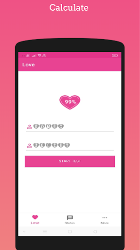Free love Test calculator app on your friends, your beloved partner or share your love match result with them by sharing it.