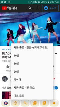 4. 다크 모드: 동영상의 노래 또는 음성만 듣고 싶을 때, 다크 모드(종료시간설정 필요)는 어두운 화면, 비활성화된 화면 터치, "광고건너뛰기"의 자동클릭을 제공.