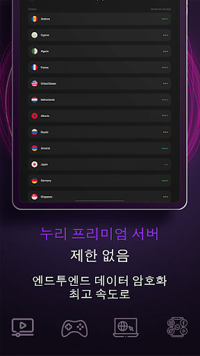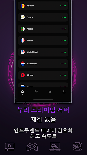 속도 또는 트래픽 제한 없음 : 원하는만큼 시청, 다운로드, 재생, 전송하고 최고 속도로 수행하십시오. 주요 위치의 대규모 서버 컬렉션을 통해 특정 국가에서 사용할 수 없는 리소스에 액세스하거나 연결 속도를 높일 수 있습니다.