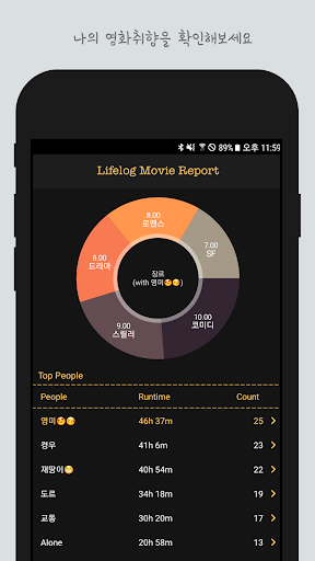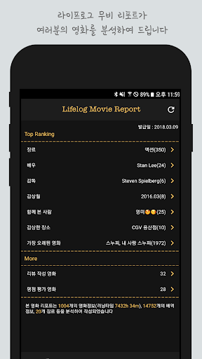 내가 본 다양한 영화를 등록한 후, '라이프로그 무비 리포트'를 생성해 보세요. 등록된 영화정보와 기록한 감상정보를 기반으로 다양한 통계정보를 확인할 수 있습니다.
