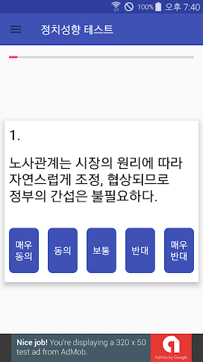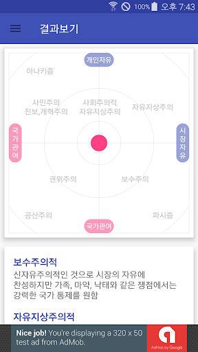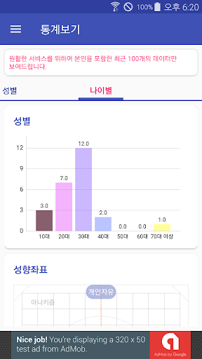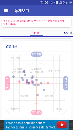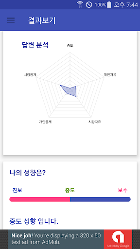 나의 정치 성향은? 진보? 보수? 단지 몇분이면 됩니다. 간단한 질문으로 당신의 정치성향을 정확히 파악하여 드립니다. 현재 성별, 나이별 통계를 확인할수 있고 곧 지역별 통계 기능 추가 예정입니다. ---- 개발자 연락처 : 경기도 수원시 팔달구 덕영대로 697번지 48 821020092595 (전화대신 문자 부탁드립니다.)