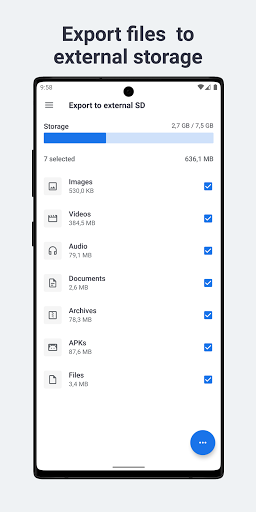 이미지, 비디오, 오디오, 문서, 아카이브 및 APK를 외부 저장소 D로 이동 D evice (SD 카드 또는 USB).