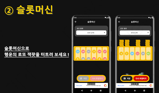 - 1등잭팟을 향해 돌아가는 슬롯머신을 돌리면, 로또볼이 하나씩 멈추면서 당신의 잭팟번호를 알려드립니다.