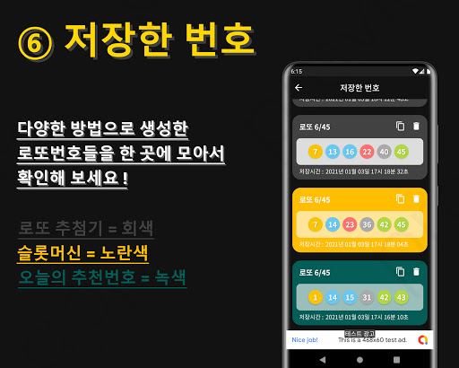 - “로또 추첨기”, “슬롯머신”, “오늘의 추천번호”에서 만들어진 번호들을 한 곳에 모아서 확인 할 수 있습니다.