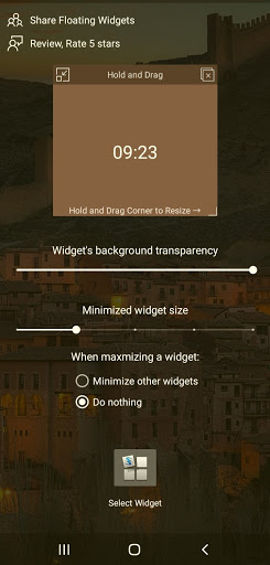 플로팅 위젯을 부동 아이콘으로 바꾸는 기능을 최소화하는 최소화 기능을 사용하여 응용 프로그램의 위에 떠있는 즐겨 찾는 위젯을 선택하십시오..