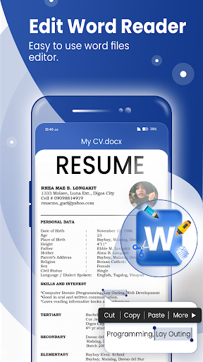DOCX 파일 리더 응용 프로그램을 통해 DOCX 파일을 열고 읽으십시오. 이 응용 프로그램은 Word 파일, Doc 파일 및 Docx 파일을 읽고, 이름 바꾸기,보기, 삭제 및 검색 할 강력한 도구를 포함하는 Android 장치 용입니다. Docx Word Files Viewer 및 Reader App에는 모든 Word Office 파일, SmartPhone에서 사용할 수있는 한 곳에서 .doc 또는 .docx로 포맷 된 모든 문서를 수집 할 수 있습니다. 이 Word Office 파일 오프너 응용 프로그램으로 휴대 전화를보다 효율적으로 만드십시오. 문서 리더 앱은 또한 랩톱을 들고 데스크톱 컴퓨터 앞에 앉아 있지 않고 읽기 및 학습 기술을 닦는 데 도움이됩니다. 필요한 것은 DocX 파일, Doc 파일 및 Word Docutwors를 배우고 읽을 수있는 Docx Files Pocket Reader 응용 프로그램 일뿐입니다. 이 무료 Office Word Viewer 및 Reader App은 모든 Wi-Fi 연결을 읽을 수있는 모든 단어 파일 및 문서를 읽을 수있는 간단한 Docx 리더 응용 프로그램 일뿐입니다.