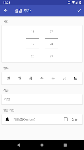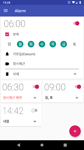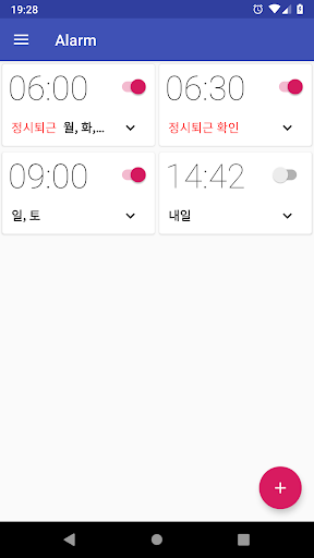 심플한 알람 앱입니다. - 알람추가, 편집, 삭제 - 알람 볼륨 조절, 해제시간 설정 가능 - 다시 울림 간격 설정 가능 필수 접근권한 - 사진, 미디어, 파일 사용 : 스마트폰에 저장된 알람음을 불러오기 위함
