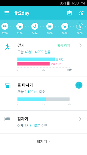 fit2day는 당신이 잠에서 깨어나고, 하루 동안 다양한 생체활동을 하고 다시 잠자리에 들 때까지, 건강한 하루 습관을 만들 수 있게 도와줍니다.