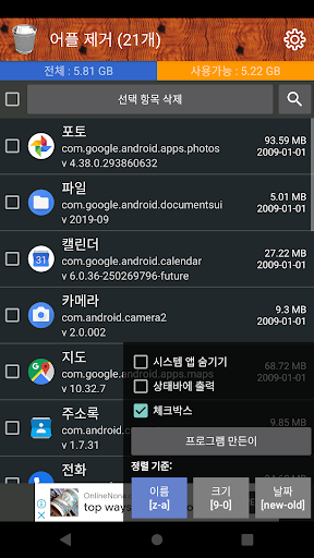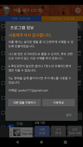 많은 어플을 설치후에 "삭제"할때 편리한 어플입니다. (프로그램삭제 할 때 유용합니다) * 앱의 패키지명, 설치 날짜, 크기, 버젼을 쉽게 확인할 수 있습니다. * Long 클릭시 기능을 제공하는 메뉴가 보여집니다. * 시스템 어플과 유해 차단 앱은 삭제할 수 없습니다. ---- 개발자 연락처 : 02-847-4785