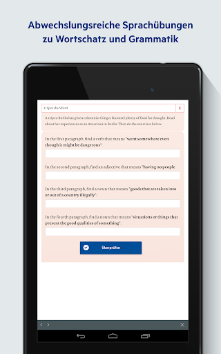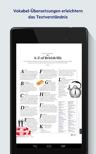 • 각 텍스트 독일어 소개와 영어 - 독일어 어휘력이 있습니다. • 어려운 단어는 밑줄이 그어지고 독일어로 번역됩니다. • 월간 새로 작성 : 기사와 연습을 가진 78 페이지.
