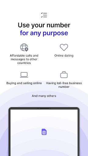 비즈니스 또는 개인용으로 2nd line으로 이상적입니다. 이 second phone number를 사용하면 익명의 SMS 및 깨끗한 모바일 VOIP WiFi calling을 즐길 수 있습니다. 또는 네트워크 데이터를 활용할 수 있습니다.
