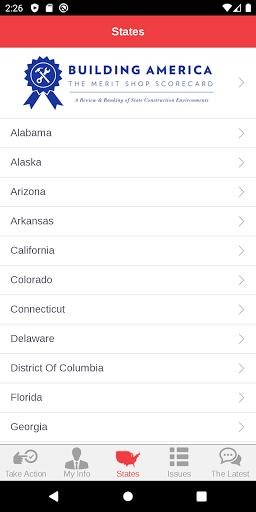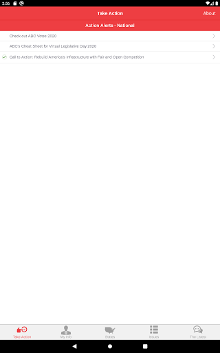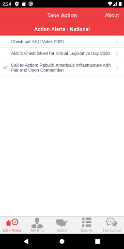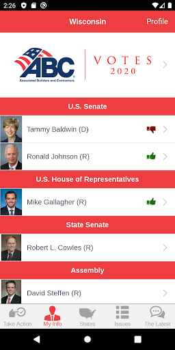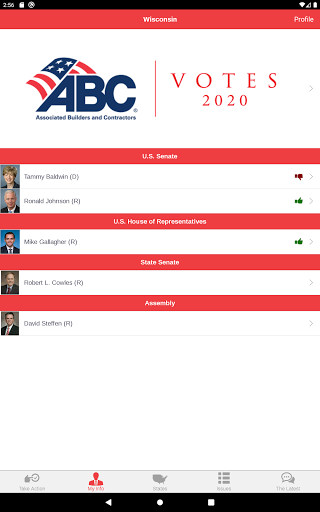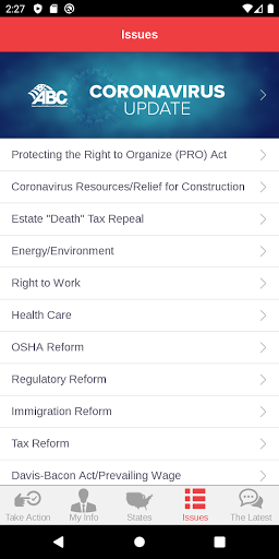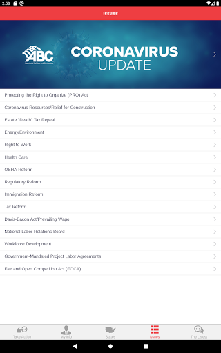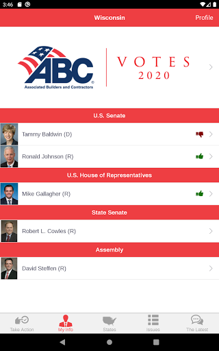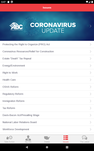 ABC Action은 회원들이 ABC의 풀뿌리 옹호 노력의 중요한 부분이되도록하는 고급 옹호 도구입니다. 사용자는 작업 경고에 응답하고 건설 업계에 중요한 최신 정책 문제에 대한 워싱턴 D.C.에서 연방 대표자와 신속하게 통신 할 수 있습니다. 당신의 대표자가 투표 방법을 알아보십시오 최신 유지하고 정보를 공유 이메일, 페이스 북, 링크드 인과 트위터를 통해에서