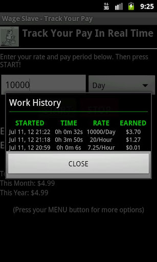 See how much you're earning every second with this easy to use wage/pay tracking app. Just enter your pay rate, and whether it's per hour, day, or week and press start. Select stop to see your final total.