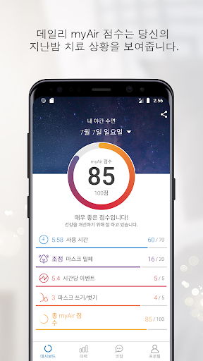 myAir는 CPAP을 처음 사용하거나 장기간 사용하고 있는 사용자들이 치료 진행 상황을 쉽게 확인할 수 있도록 도와줍니다. 치료 세션이 끝나면, 당신의 Air10(에어센스10) 양압기는 자동으로 myAir 에 데이터를 업로드 하게 됩니다. 이후 언제든지 로그인하여 양압기 치료에 대한 중요한 정보를 확인 할 수 있습니다.