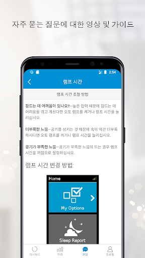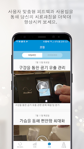 myAir는 사용자에게 맞춤화된 데이터 이 외에도 꾸준하고 편안한 치료를 이어나가기 위해 유용한 사용 팁과 교육 비디오를 제공합니다.