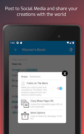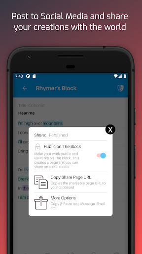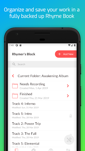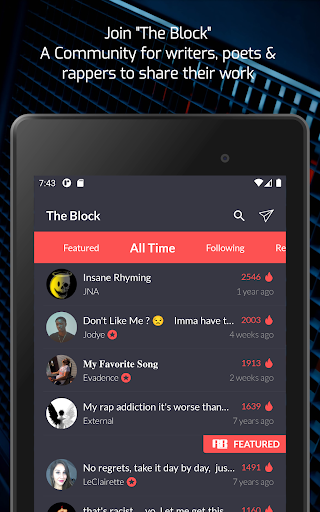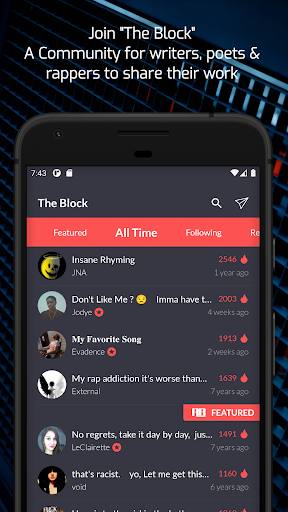 A Rhyming app with a social network? Yes! The best way to be inspired is by connecting with others. Share your work on The Block and get feedback. Explore the creativity of others. Give Respect and add comments. It's like a 24/7 Poetry Slam.