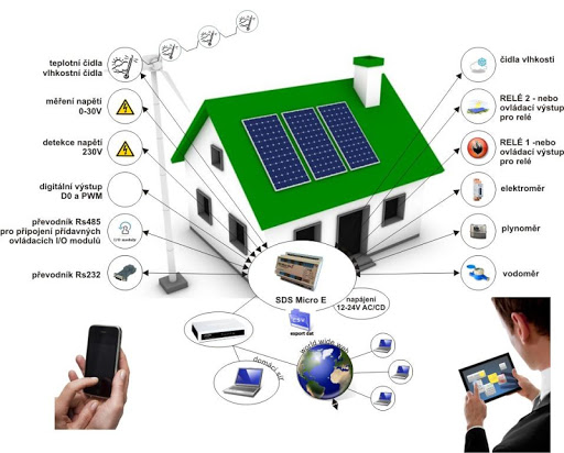 Naše malé, inteligentní moduly SDS MICRO - a vyšší verze SDS MACRO či SDS TTCPRO umožňují ONLINE sledování údajů o spotřebě a odběru energií a provádění dálkových odečtů, měřit teploty a vlhkosti. Aktuální stavy odběru všech zařízení (nejčastěji elektroměr, vodoměr, plynoměr), lze pohodlně sledovat přes webový prohlížeč na počítači, tabletu či telefonu. Každý modul je autonomní zařízení. Umí automaticky podle těchto hodnot provádět inteligentní samostatné řízení.