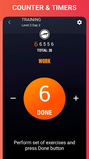 시작하기 전에 테스트 수행 훈련. 이 테스트는 한 번에 수행 할 수있는 최대 푸시 업 수를 결정하는 것입니다. 이제 테스트 결과를 기반으로 프로그램을 선택하고 교육을 시작하십시오. 각 세트 후에 버튼을 눌러 REST TIMER (권장 시간에 대한 휴식 또는 감정에 따라 변경)를 호출하십시오. 휴식과 적절한식이 요법을 관찰하십시오.