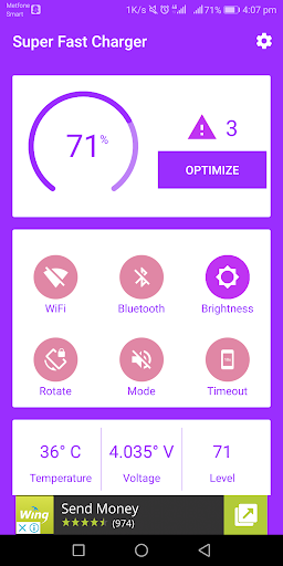 - Automatically fast charging optimization: Ram booster, turn off wifi, turn off bluetooth, reduce screen brightness min...