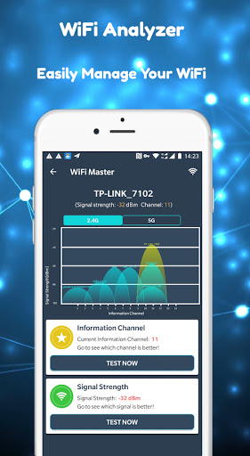 Wi-Fi Analyzer - WiFi 스캐너는 WiFi 신호를 테스트, 신호 강도, 혼잡 한 신호 및 채널 등급을 통해 WiFi 네트워크를 분석하고 최적화하는 데 사용됩니다.