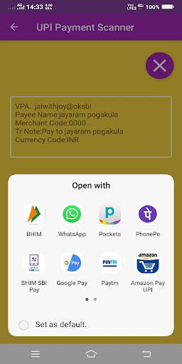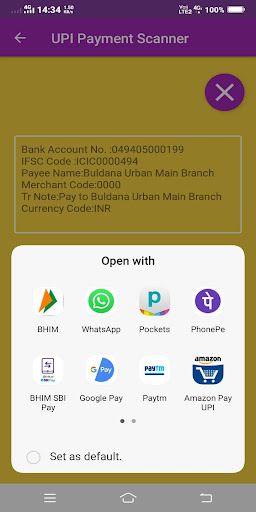 모바일에서는 UPI 앱을 선택하고 스캐너가 선택한 UPI 응용 프로그램에 지불 매개 변수를 통과합니다.